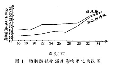從圖1中的極端值可以看出:旋風(fēng)磨環(huán)境溫度相差19e,脂肪酸值相差4.9mgKOH/100g;樣品粉碎機(jī)環(huán)境溫度相差19e,脂肪酸值相差6.6mgKOH/100g。其余各不同溫度點脂肪酸值也有一定的差值。