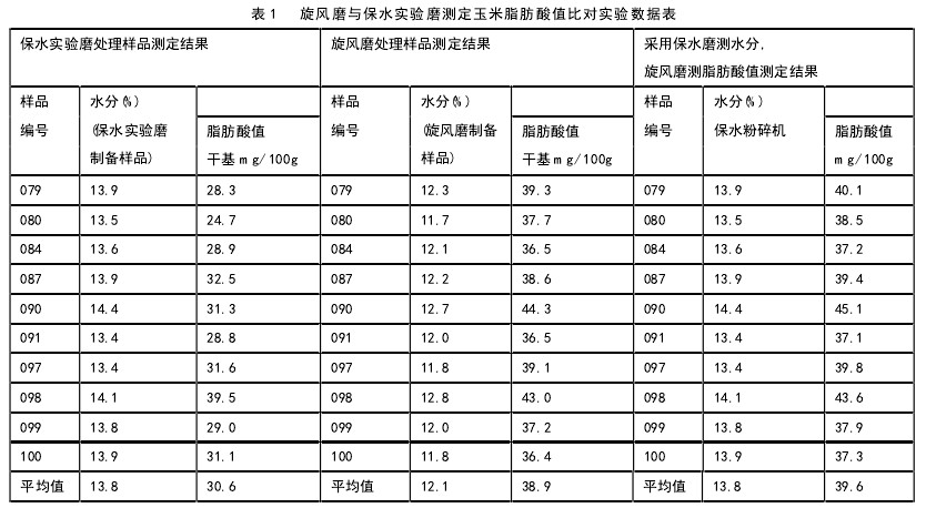 在玉米、稻谷脂肪酸值的測(cè)定過(guò)程中要使用到不同的實(shí)驗(yàn)?zāi),因(yàn)橹舅嶂狄愿苫?jì)算,測(cè)定玉米、稻谷水份使用保水實(shí)驗(yàn)?zāi);制備樣品使用錘式旋風(fēng)磨。在實(shí)際工作中,單一使用保水磨或單一使用旋風(fēng)磨處理樣品對(duì)測(cè)定脂肪酸值的影響進(jìn)行探討。我們抽取了不同水分的10個(gè)玉米、10個(gè)稻谷樣品做對(duì)照實(shí)驗(yàn),分別使用三種方式處理玉米、稻谷樣品測(cè)定樣品干基脂肪酸值。