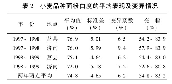 從以上分析可以看出,近幾年來我國選育和推廣的小麥品種的面粉白度與以往育成品種相比沒有提高,反而略有下降。
