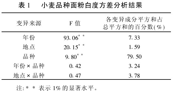 2.11 品種、年份和地點(diǎn)對(duì)面粉白度的影響將兩年兩點(diǎn)方差分析結(jié)果列于表1.由表1可以看出,面粉白度在年份間、地點(diǎn)間和品種間均存在極顯著差異,而年份@品種和地點(diǎn)@品種互作不顯著,在各變異成分平方和占總平方和的百分?jǐn)?shù)中以品種所占的百分?jǐn)?shù)最大,以上結(jié)果說明年份、地點(diǎn)和品種對(duì)面粉白度均有顯著的影響作用,但品種的作用最為重要,即品種是影響面粉白度最重要的因素,通過遺傳改良可以顯著提高小麥品種面粉白度。