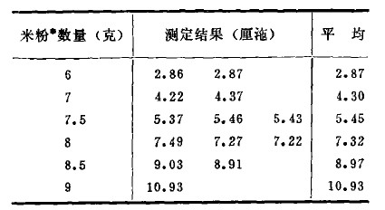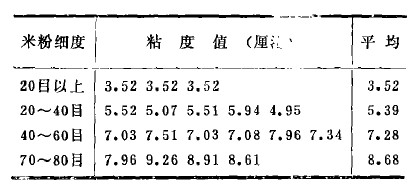 上表說(shuō)明了隨著米粉細(xì)度加大,粘度值也相應(yīng)增加。在實(shí)驗(yàn)過(guò)程中,我們?cè)?jīng)使用20-80目的米粉樣品制備米汁,發(fā)現(xiàn)由于細(xì)度范圍控制不嚴(yán),同一份樣品測(cè)定結(jié)果相差很大:粗粒比例大的米粉樣,其結(jié)果為6.12厘拖;細(xì)粒比例大的米粉樣,其結(jié)果為7. 32厘拖。