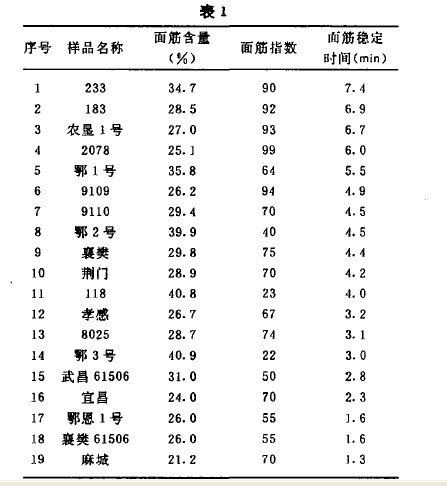 另外,從表1的數(shù)據(jù)計(jì)算出小麥面筋含量與面筋穩(wěn)定時(shí)間的相關(guān)系數(shù)為(n二19,丫一0.245),小麥面筋指數(shù)與面筋穩(wěn)定時(shí)間的相關(guān)系數(shù)為(n一19,丫-0.521),后者達(dá)到顯著相關(guān)水平,但小麥面筋數(shù)對(duì)面筋穩(wěn)定時(shí)間的影響比小麥面筋含量大。