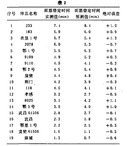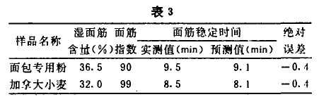 由表3可看出:利用上述二元回歸方程來(lái)預(yù)測(cè)面包專用粉和加拿大小麥的面筋穩(wěn)定時(shí)間,其絕對(duì)誤差均小于1min.因此,可認(rèn)為上述二元回歸方程也適用于各類專用粉及進(jìn)口小麥。