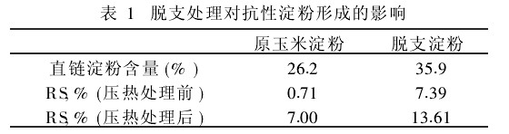 直鏈淀粉含量對抗性淀粉的形成有顯著影響,直鏈淀粉含量與抗性淀粉產(chǎn)率明顯呈正相關(guān)。脫支處理使直鏈淀粉含量明顯提高,經(jīng)壓熱處理后,抗性淀粉產(chǎn)率有大幅度增加,表明僅直鏈淀粉參與了抗性淀粉的形成,支鏈淀粉不利于抗性淀粉的形成。