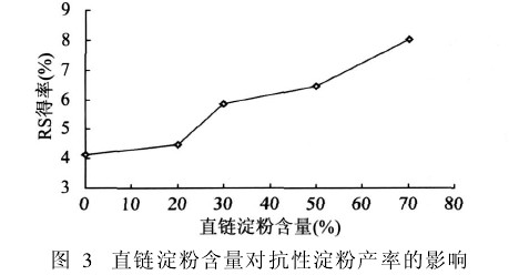 為了考察不同直鏈淀粉含量對抗性淀粉得率的影響,用純直鏈淀粉和純支鏈淀粉按不同比例配成不同含量的混合物,直鏈淀粉含量分別為0%、20%、30%、50%和70%,然后在同樣的條件下進(jìn)行壓熱處理,結(jié)果如圖3所示。很明顯,隨著直鏈淀粉含量的增大,抗性淀粉的得率不斷上升,二者為明顯的正相關(guān)。表明直鏈淀粉含量的增加,促進(jìn)了抗性淀粉的形成,這與Sievert的結(jié)論完全一致[18].