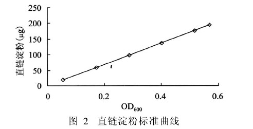 回歸方程: y=342113x+011766相關(guān)系數(shù): Y=019996從直鏈淀粉標(biāo)準(zhǔn)曲線(圖2)看到,直鏈淀粉的量與600nm處的光密度呈顯著的線性正相關(guān)。