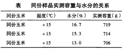 依據(jù)玉米的純糧率定等是不能反映出玉米的真實質量,因此,新的糧食國家標準改用容重定等。今年我?guī)焓召彽挠衩状蟛糠质且匀葜囟ǖ,它既能準確地體現(xiàn)玉米的質量,也使農民感到滿意,但在實際工作中也遇到不少疑難問題。新標準規(guī)定:試樣溫度在0℃(含)以下時水分含量在23.0%(含)以下的玉米實際容重為實測容重,然而北方的特殊氣候決定了糧溫在0℃以下,玉米水分很大,有的甚至達到35%一36%.經(jīng)筆者實測三份不同溫度與不同水分的玉米容重差異如下(見表)。