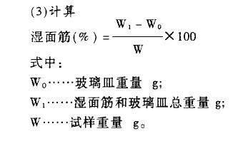 將洗好的面筋用手反復(fù)壓擠,直到稍感有粘手時(shí)為至。將面筋放在預(yù)先稱重的皿上稱得總重量。