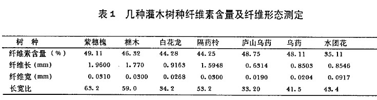 2.2纖維形態(tài)測(cè)定結(jié)果表明(見表l):纖維長(zhǎng)寬比以紫穗槐最大為63.2,廬山烏藥最小33.2,其比值大小依次為:紫穗槐,糙木、隔藥拎、水團(tuán)花、烏藥、白花龍、廬山烏藥;除廬山烏藥和白花龍外均符合造紙樹種要求(造紙樹種一般要求纖維長(zhǎng)寬比在35以上)2.3結(jié)果分析得出初步的結(jié)論:紫穗槐、批木、隔藥拎、烏藥4種灌木樹種其纖維含量和纖維形態(tài)均符合造紙樹種要求。