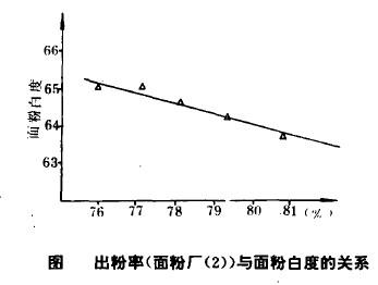 用從三家面粉廠取來的基本粉和質(zhì)量比較差的面粉配制成的3組不同出粉率和灰分含量的面粉(不經(jīng)任何形式的漂白處理)其出粉率和面粉白度有很好的相關(guān)性,其相關(guān)性系數(shù)為:面粉廠(l)為一0.9609,面粉廠(2)為一0.9704,面粉廠(3)為一0.9992.面粉出粉率越低,面粉白度越高,而且面粉白度是一個很靈敏的指標(biāo),能夠甄別出面粉之間微小的差別。這表明對用同一種原料加工成的面來說,面粉白度與面粉的加工精度有密切的關(guān)系。圖1~3所示為3組面粉的出粉率與白度的關(guān)系。