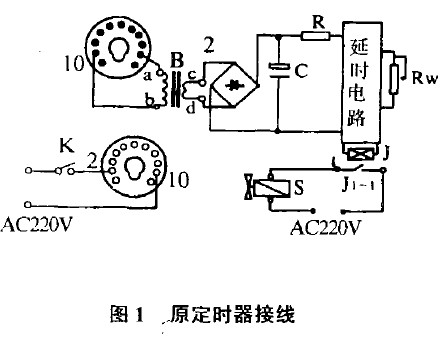 在有加堿指令時(shí),加堿泵不工作。在儀器中有四只相同的(305)定時(shí)器,外型為插人式大11腳封裝,所以在需要更換時(shí)顯得特別方便,型號(hào)為SA46720,工作電壓為AC22OV,國(guó)內(nèi)沒(méi)有相同產(chǎn)品,曾與儀器生產(chǎn)廠家聯(lián)系,這種型號(hào)廠家早已不生產(chǎn)了,經(jīng)我們拆開檢查,發(fā)現(xiàn)是定時(shí)器TE的供電變壓器B,(220V/24碼燒壞,但定時(shí)電路完好,這種小型變壓器由于體積很小,國(guó)產(chǎn)最小的產(chǎn)品也不能裝人,以前我們?cè)鴥捍沃乩@,由于休積小,電壓高,重繞后也維持不了多久,后來(lái),我們將其部分電路稍加改動(dòng)后,即徹修復(fù),見(jiàn)圖1,定時(shí)器(TE)的電壓端是通過(guò)堿泵控制開關(guān)K接人定時(shí)器管座的2,10兩腳,插頭相應(yīng)的2,10兩腳接定時(shí)器內(nèi)部的電源變壓器B的a、b、次級(jí)c、d經(jīng)硅橋整流后給定時(shí)電路供電,其中D為硅橋,R、C為租容濾波元件,Rw為時(shí)間設(shè)定,J為定時(shí)器輸出控制繼電器,J1一1是J的控制觸頭,S為堿泵電機(jī),當(dāng)加堿時(shí)K閉合,AC220V經(jīng)管座接口進(jìn)人B的初級(jí),次級(jí)電壓整流濾波后供給定時(shí)器電路,設(shè)定時(shí)間到后,繼電器吸合,其觸頭l,4閉合啟動(dòng)加堿電機(jī),開始執(zhí)行加堿程序。
