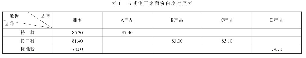1) 湖南省冷水灘面粉廠制粉生產(chǎn)線全面技術(shù)改造后,“湘君牌”系列面粉總出粉率達(dá)到 75 %, 因受生產(chǎn)工藝的制約, 無法對聯(lián)產(chǎn)粉的比例進(jìn)行調(diào)整,“湘君牌”面粉白度指標(biāo)比周邊廠家生產(chǎn)的同一品種的面粉白度低 1.5 以上, 經(jīng)濟(jì)效益受到影響。見表 1.