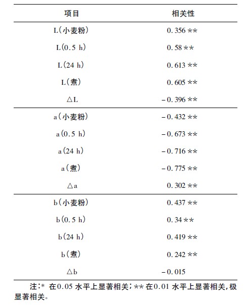 △L與面條感官評(píng)價(jià)色澤評(píng)分呈極顯著負(fù)相關(guān),面片放置24 h 后L 值的變化范圍小,面條色澤評(píng)分往往會(huì)比較高; △a 與面條感官評(píng)價(jià)色澤評(píng)分呈極顯著正相關(guān),其中△a 為負(fù)值,這也同樣表明了a值的變化范圍越小,面條色澤評(píng)分也就越高。從表2中也可以看出,色澤評(píng)分較高的面條放置24h后,其變暗和變紅的趨勢(shì)也會(huì)比較小。色澤評(píng)分與黃度值24 h 的變化不相關(guān)。