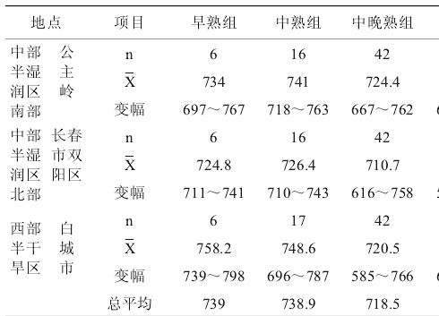 玉米品種容重的總趨勢(shì),熟期早的品種容重相對(duì)高,熟期越晚的品種容重越低?傮w看玉米容重公主嶺 > 白城 > 雙陽(yáng)。早熟組、中熟組在白城生態(tài)區(qū)容重最高;中晚熟組、晚熟組(含耐密組、高油組) 在公主嶺所處生態(tài)區(qū)容重最高。同一生態(tài)區(qū)內(nèi)、同一組品種中容重有很大差異(少的差幅 30 g/L~50 g/L,大的差幅 140 g/L 以上),這就為選擇高容重玉米品種提供了必要和可能。