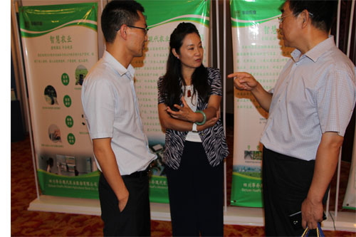 圖為:陳渝陽(yáng)總經(jīng)理(右二)和王建躍(右一)副廳長(zhǎng)交流物聯(lián)網(wǎng)在農(nóng)業(yè)生產(chǎn)中的應(yīng)用情況