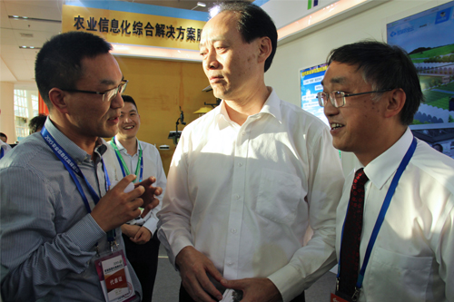 農(nóng)交會(huì)期間,農(nóng)業(yè)部余欣榮副部長(zhǎng)、農(nóng)業(yè)部市場(chǎng)與經(jīng)濟(jì)信息司王小兵副司長(zhǎng)一行蒞臨托普展區(qū)參觀指導(dǎo)。余副部長(zhǎng)表示,農(nóng)業(yè)物聯(lián)網(wǎng)技術(shù)應(yīng)用除了現(xiàn)有的系統(tǒng)及硬件以外,還要與射頻技術(shù)緊密結(jié)合,提高物聯(lián)網(wǎng)的科技含量。屈冬玉副部長(zhǎng)和斯洛文尼亞副總理一行也蒞臨托普展區(qū),并與陳渝陽(yáng)總經(jīng)理親切交談。雙方就農(nóng)業(yè)物聯(lián)網(wǎng)的研發(fā)推廣以及落地應(yīng)用等問(wèn)題進(jìn)行交流。