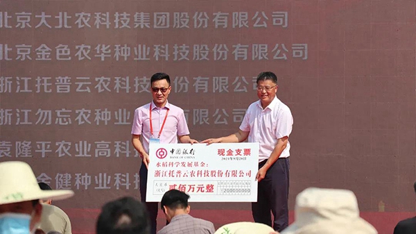 托普云農(nóng)董事長陳渝陽向“水稻科學(xué)發(fā)展基金”捐贈資金