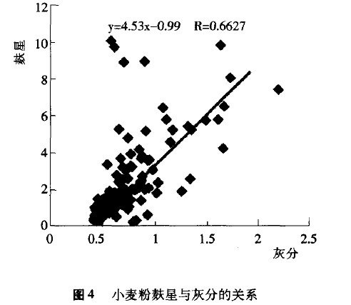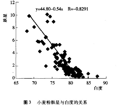 在不同圖像采集條件下,對133份不同粉路樣品的圖像進行分析處理并計算其中斑點面積,實驗結(jié)果表明:分割圖像的灰度0.9值在一定范圍內(nèi)取值,計算出的圖像斑點面積與小麥粉白度都呈線性相關(guān),與灰分也具有一定的相關(guān)性。因此,本方法通過目測確定鼓星顆粒,找出其在圖像中對應的灰度值,以此灰度值作為計算鼓星斑點面積的灰度閡值。133份不同粉路小麥粉樣品的鼓星與白度、鼓星與灰分的關(guān)系如圖3、圖4所示,從圖中可以看出,鼓星與白度呈線性負相關(guān),而鼓星與灰分有一定的相關(guān)性。不同粉路的樣品是來至于碾磨程度不同的小麥粉,混人其中的鼓皮量和整體白度有明顯的差別,它們可以作為小麥粉加工精度的典型樣品。從以上各圖和相關(guān)性數(shù)據(jù)來看,粉色與白度和灰分、熬星與白度之間都具有很好的相關(guān)性。所以,采用數(shù)字圖像處理技術(shù)建立的小麥粉粉色、鼓星測定方法,能夠用于正確地評價小麥粉的加工精度。